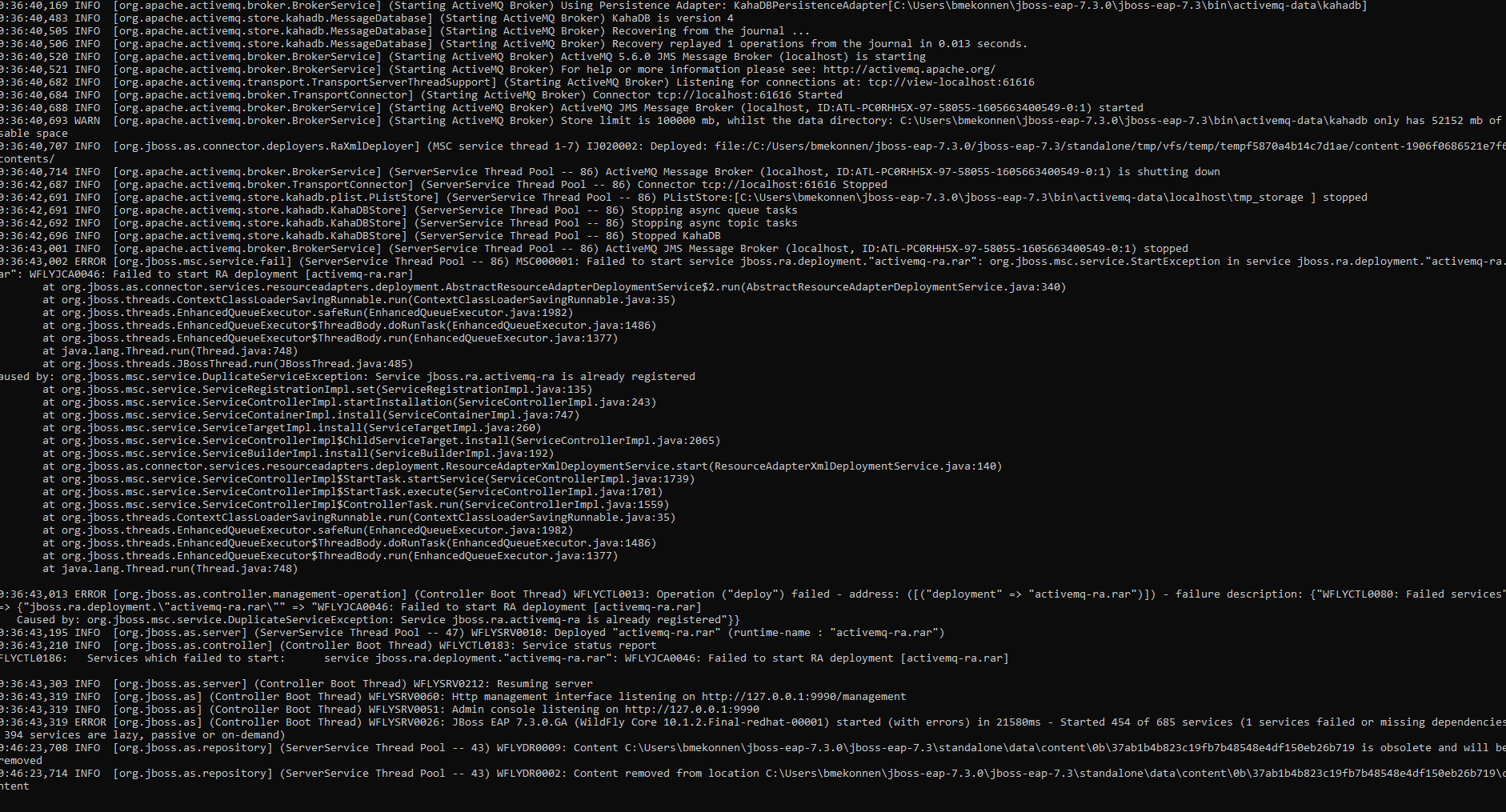 **Caused by: org.jboss.msc.service.DuplicateServiceException: Service jboss.ra.activemq-ra is already registered**我真的很感激任何关于为什么我会得到这个异常的指导。我在下面附上了日志中的一张图片.