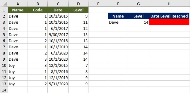 参考表有4列: Name (col )。( A),代码B),日期(C)( C),和级别(水平)d)。“姓名”包含雇员的名字(戴夫或Joy)。“代码”记录发生的行为类型(1 =促进,2和3不重要)。“日期”记录操作发生的日期。“级别”记录员工达到的薪酬水平(级别数越高,薪资越高)。