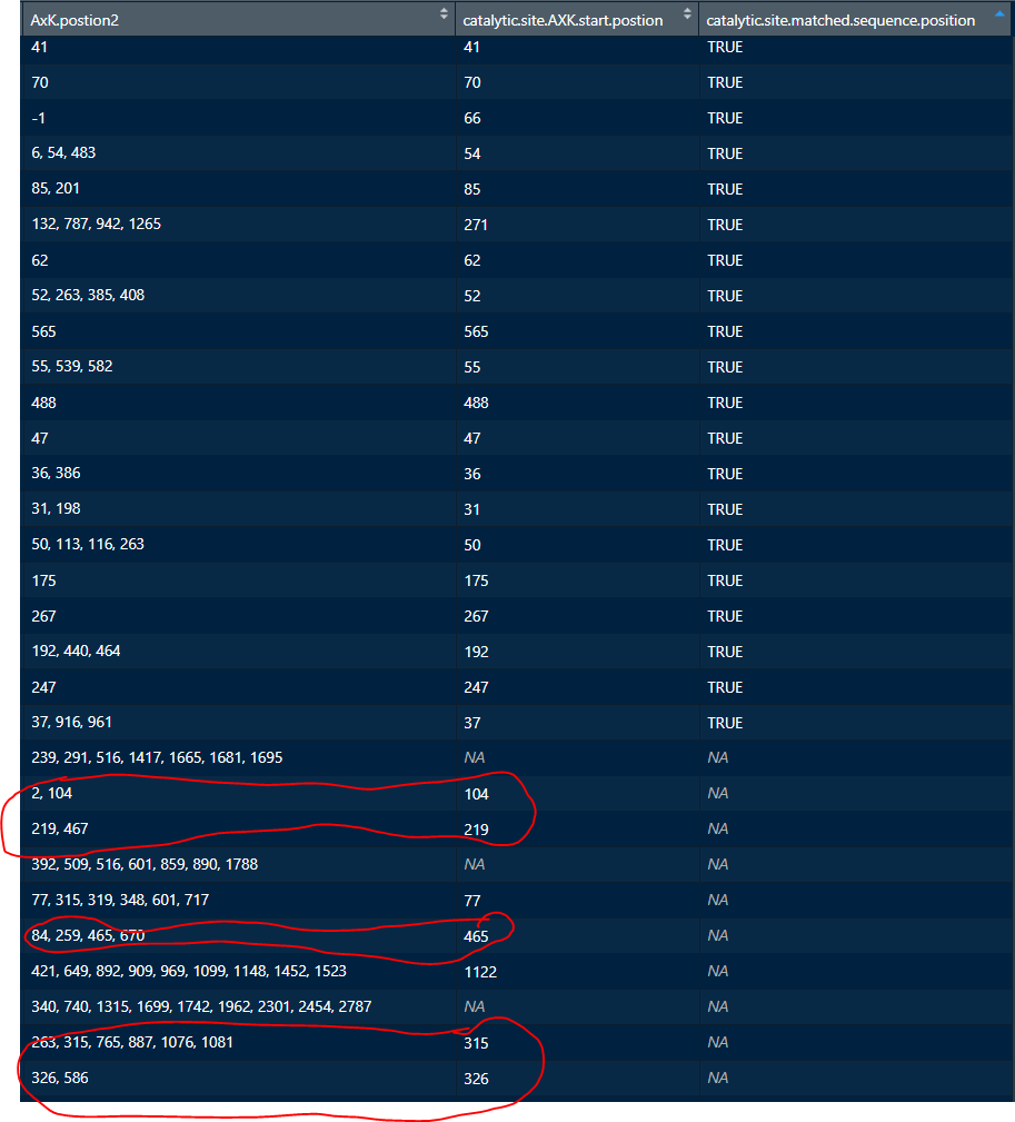 df4$catalytic.site.matched.sequence.position[which(df4$catalytic.site.AXK.start.postion %in% df4$AxK.postion2)] <- TRUE