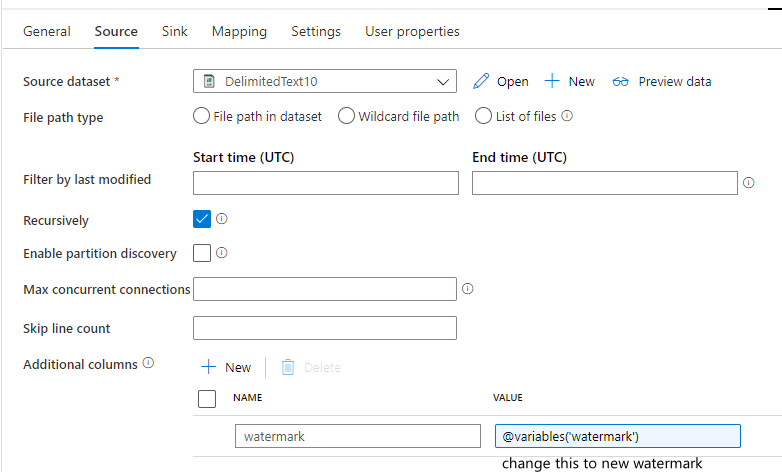 源数据集和接收器数据集是相同的。将附加列中的表达式更改为@{activity('LookupNewWaterMarkActivity').output.firstRow.NewWatermarkvalue}