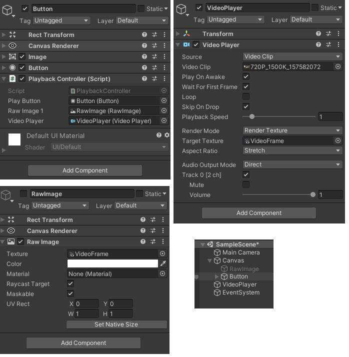 GraphicRaycaster组件吗?您是否通过检查器或代码订阅了按钮的onClick事件?场景中有EventSystem吗?VideoPlayer中呈现模式是渲染纹理,那么是否将RawImage指定为目标纹理?这是你需要拥有的一个例子: