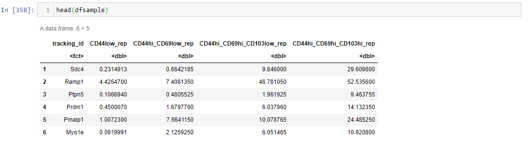 首先,我希望筛选值等于或大于1的行,然后根据最后三列("CD44hi_CD69low_rep“、"CD44hi_CD69hi_CD103low_rep”、"CD44hi_CD69hi_CD103hi_rep")的比较筛选与列(CD44low_rep)相比高8倍或低4倍的行。