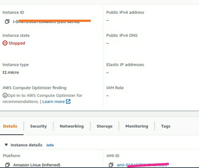 Details下的屏幕底部,您可以找到以i-*开头的实例id,并进一步滚动它将使ami id从ami-*开始。