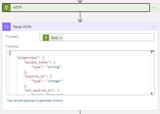 然后,2.使用"解析JSON“动作从上面的"HTTP”动作解析响应体。