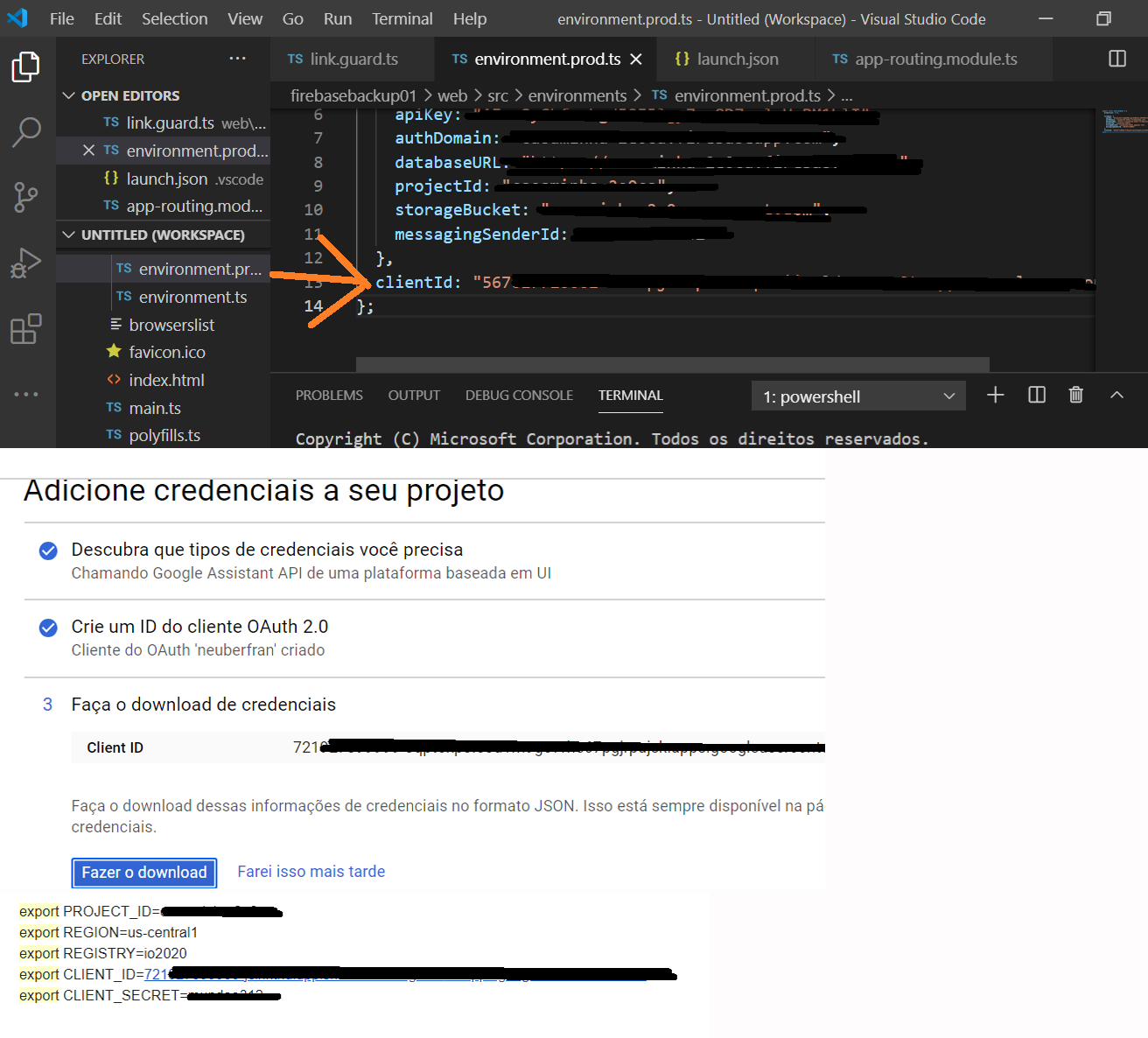 我在25.12就解决了这个问题。事实上,根据照片,我把clientId和clientSecret字段放错了。它们在角度应用程序(环境)和在google上的操作(帐户链接/设置)上是不同的。我把它们配对解决了: