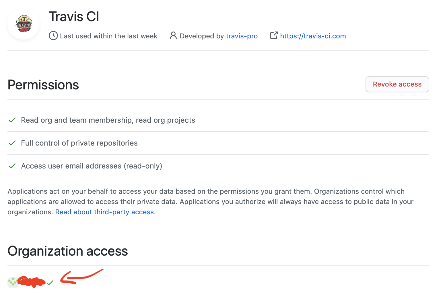 在组织所有者授予travis-ci访问该组织的权限之后,我仍然需要执行以下步骤: