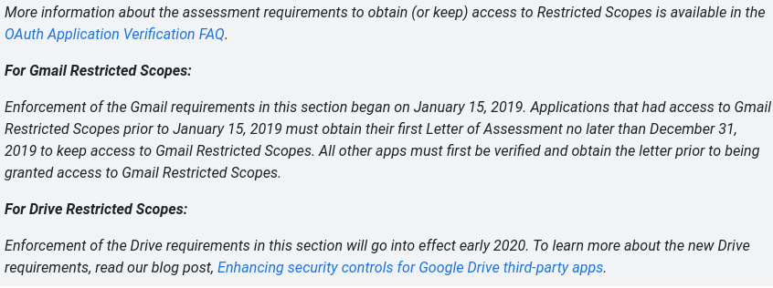对于这些附加要求,请求限制scopes.........One的应用程序是,如果应用程序从服务器或通过服务器访问或具有访问Google用户数据的能力,系统必须经过独立的第三方安全评估。