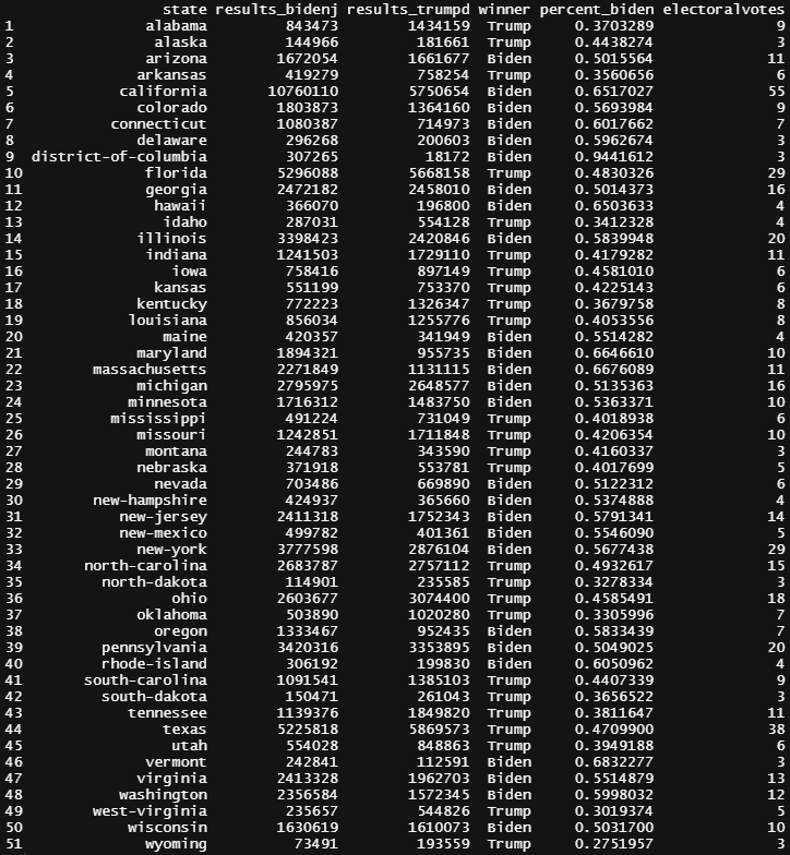 我试图用usmap包在美国地图上绘制选举结果,但是即使数据集已经完成,我还是得到了显示某些州缺少的值的图表。各州都灰蒙蒙的,我不知道为什么会这样..