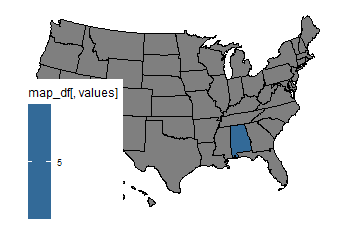 usmap::plot_usmap(data=data.frame(state=c("alabama","new-york"),s=c(5,15)), values="s")