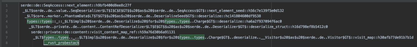 这是我在Mac上用仪器/采样器收集到的堆栈跟踪,__rust_probestack似乎是最后一个调用的函数,此时它大约有70个函数深。