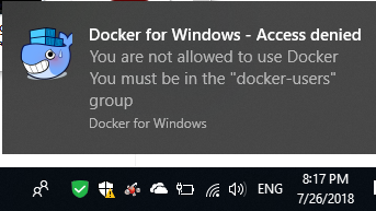 net localgroup "docker-users" "<your username>" /add一旦您收到成功的消息,就注销您的窗口,然后重新登录以激活: