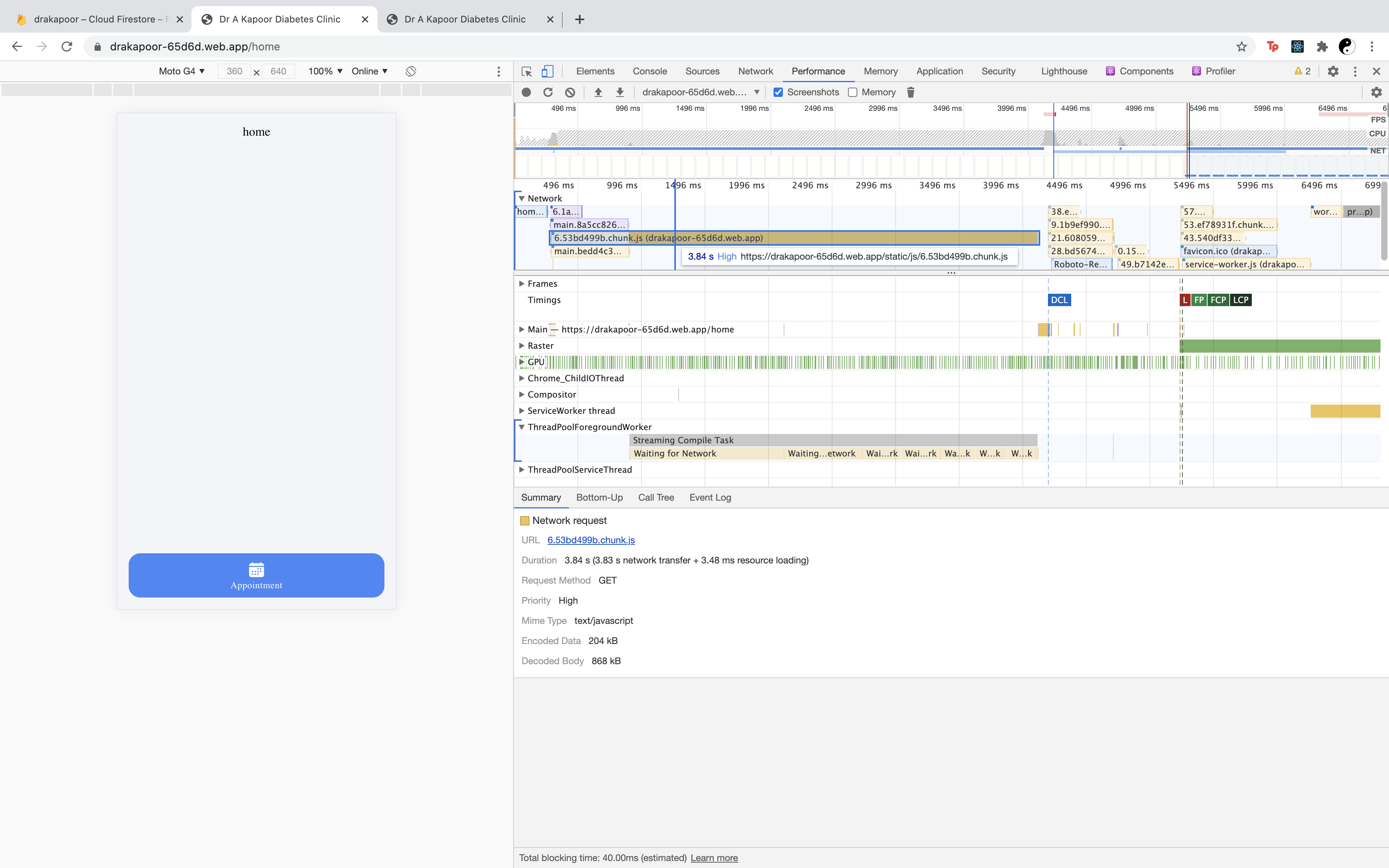 现在,如果您看到在加载一个特定的块时丢失了大约4秒"https://drakapoor-65d6d.web.app/static/js/6.53bd499b.chunk.js",我不知道其中包含了什么,我已经赞扬了整个项目并进行了部署。我如何摆脱这个问题?发生了什么事,我甚至不知道向任何方向前进……