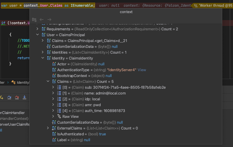});如果您不想处理令牌并在那里添加声明,那么另一种方法是在授权策略中查找其他用户详细信息。有关自定义授权策略的详细信息,请参阅此页面。
