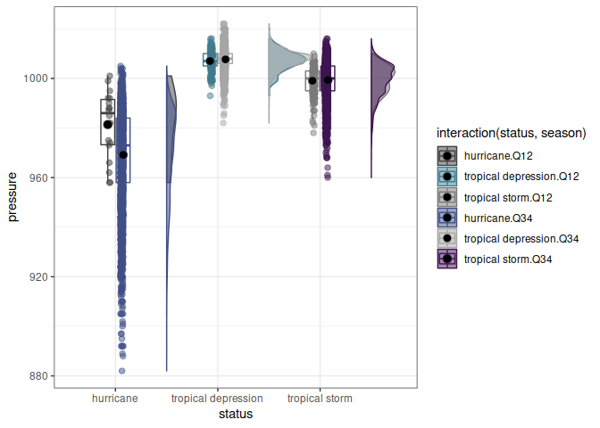ggplot(storms, aes(x=status, y=pressure, color=interaction(status, season),