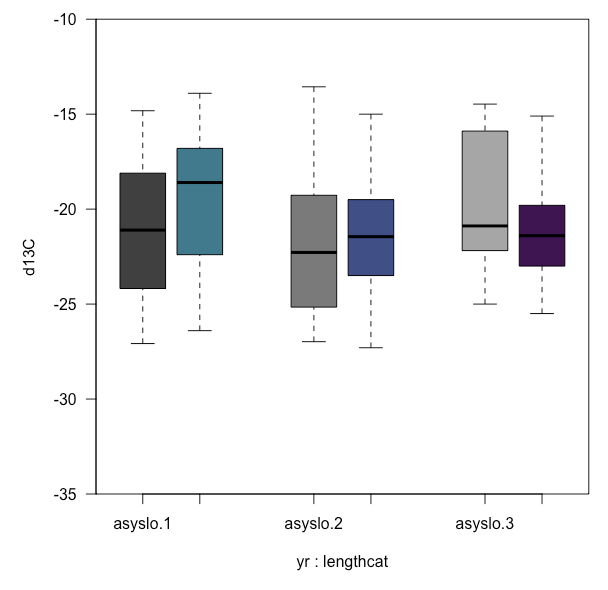 Y_C_rain= ggplot(yct_rain, aes(y=d13C, x=lengthcat,fill = yr,color=yr)) +