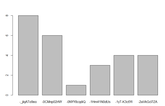 请参阅我用barplot(head(table(df$video_id)))绘制的以下图像: