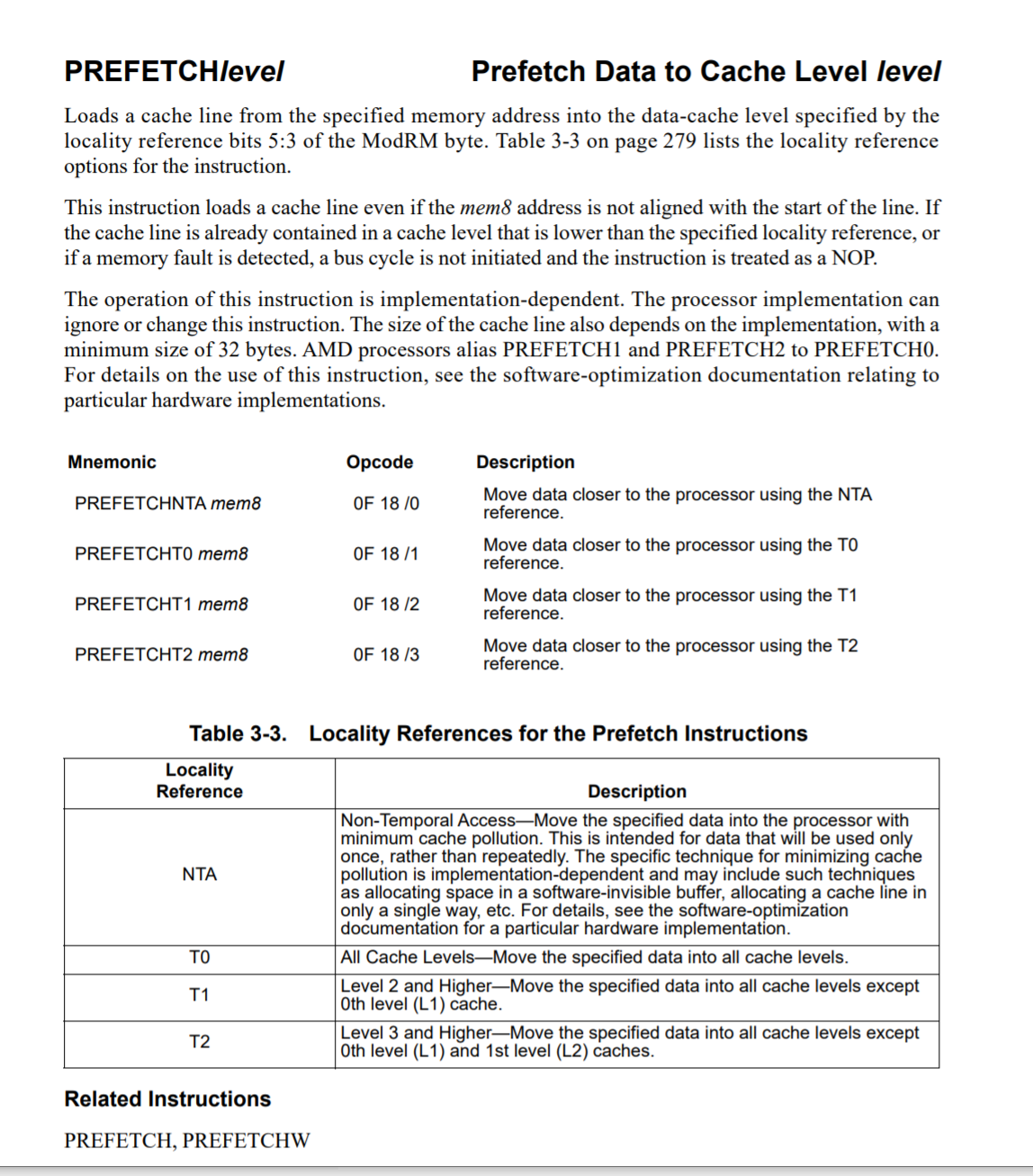 该指令的操作依赖于实现.处理器实现可以忽略或更改此指令。缓存行的大小也取决于实现,最小大小为32个字节。AMD处理器别名PREFETCH1和PREFETCH2到PREFETCH0