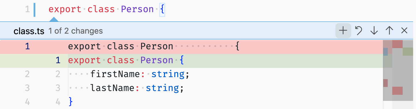 git.stageChange命令仅显示在内联diff编辑器中(显式配置为不显示在命令调色板中),可以通过单击编辑器左侧沟槽中可用的SCM编辑器装饰(添加/编辑/删除行)来访问该编辑器: