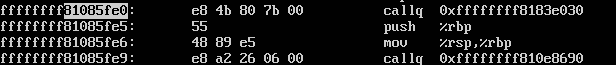 从这些图片中可以看到,在跟踪输出中,每个对应于内核符号(比较linux映像的虚拟地址与/proc/kallsyms)的调用q被替换为NOP DWORD (nopl指令)。
