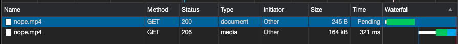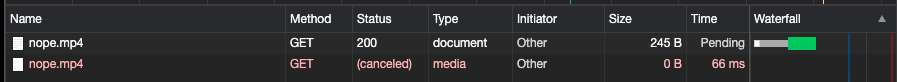 - b) HTTP 200 followed by Cancelled request, and the video obviously does not play here either