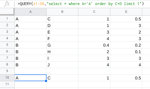 =(filter(A2:D12;A2:A12="SONY"))现在我希望过滤器给出一个单列,其中价格和运输成本是最低的,在这种情况下,产品是:
