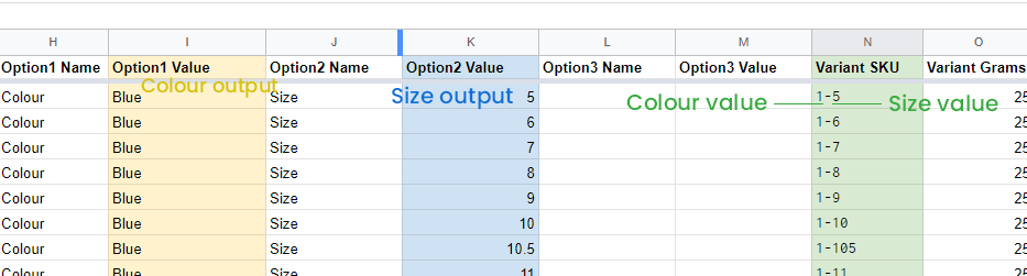 我希望创建一个CSV,它根据我在SKU中的值( N列,突出显示绿色)自动实现产品颜色和大小变量(I和K,突出显示黄色和蓝色)的自动化。