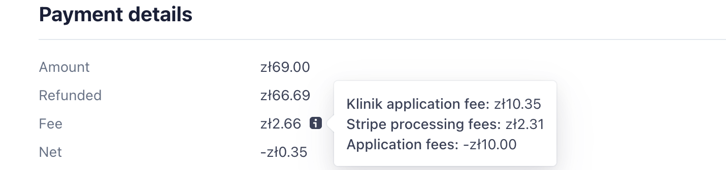 这里的答案是首先从主Stripe帐户退还费用(在这里10.35兹罗提),然后从连接帐户退还其余的费用(66.69兹罗提)。