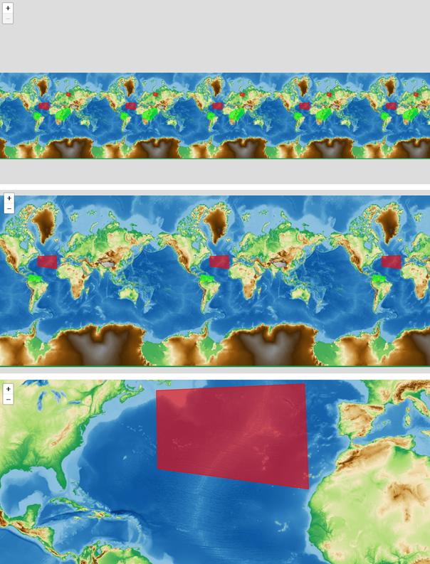 在我使用url "/geoserver/gwc/service/wms“而不是"/geoserver/wms”添加GeoWebCache之前,它工作得很好。我仍然可以看到我的多边形,当我在最小的缩放。但是当我放大时,我只看到一个红色多边形和一个绿色多边形的一半,如果我再次放大,我只看到红色多边形。您可以在下面的图像中看到这3种状态: