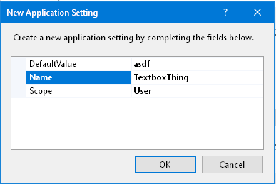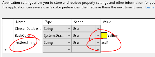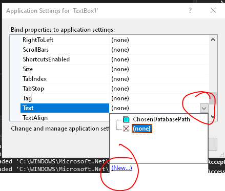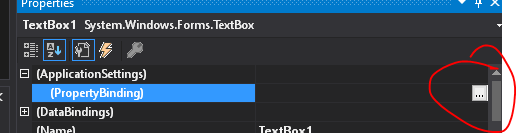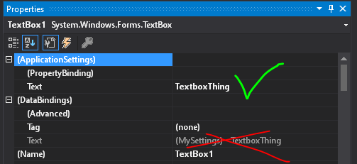 VB和VS 2019年-我有一个表单应用程序,并成功地使用My.Settings将文本框绑定到设置。它正常工作了。我最近添加了一个新表单,My.Settings没有列出数据绑定(相反,我得到了“added数据源”)。此外,我以前绑定到My.Settings的文本框不能被编辑,因为DataBndings "text“行是灰色的。它确实将前面的绑定显示为"(MySettings) - Matl2_Name“。我将我的新设置添加到My.Settings中。将设置拖放到文本框上会导致"MySettingsBindingSource - PR1Name“,而不会保存。