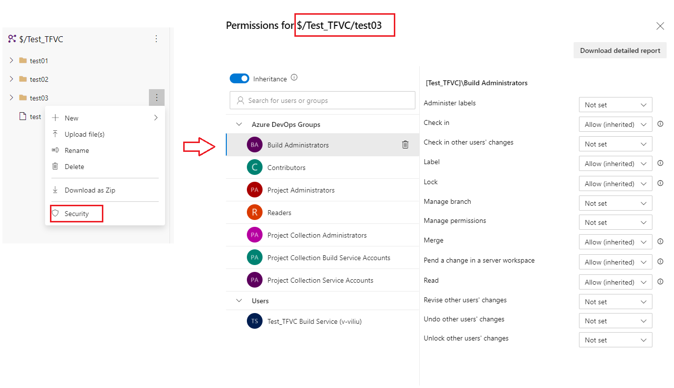 如果我们使用TFVC,则可以为用户组配置文件夹/文件权限。看下面的照片。