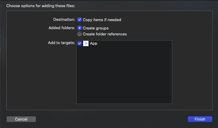 打开Xcode后,只需将文件拖到黄色App文件夹中的任何地方,Xcode将提示您,确保选中“复制项(如果需要)”,单选按钮在"Create“中,然后单击finish