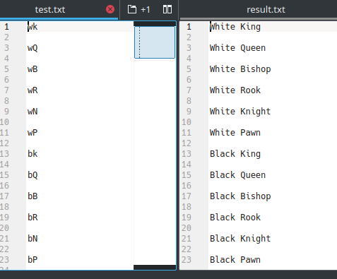 导入re;tokens = re.compile(r'^wb$') def转换(行):if (不是tokens.match(行)):返回行+‘n’;A= {"W":“白色”,"B":“黑色”}[line.upper()]b= {"K":“国王”,"Q":“女王”,"B":“主教”,"R":“鲁克”,"N":“骑士”,"P":“典当”}[行1.upper()]返回f'{a} {b}‘带开(’Result.txt‘,以open('test.txt')为读取器: line = reader.readline() line = [] while(line):writer.write(转换(行))line= reader.readline()test.txtpython conv.pyresult.txt