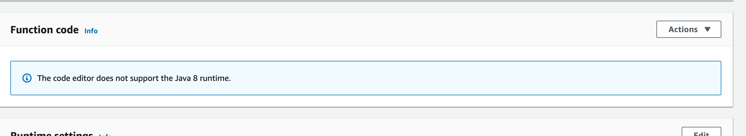 当我试图选择Java8作为我的AWS函数的运行时时,它会显示:,代码编辑器不支持Java8运行时。有人遇到过这样的问题吗?请帮帮我!提前谢谢。