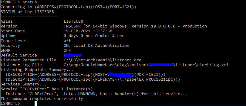 在我的本地oracle 19c安装(Windows 2016)上,一切正常运行,直到本周开始进行Windows更新。从那时起,当我试图连接到DB时,我就得到了错误ORA-12514 -TNS:侦听器目前不知道在连接描述符中请求的服务。