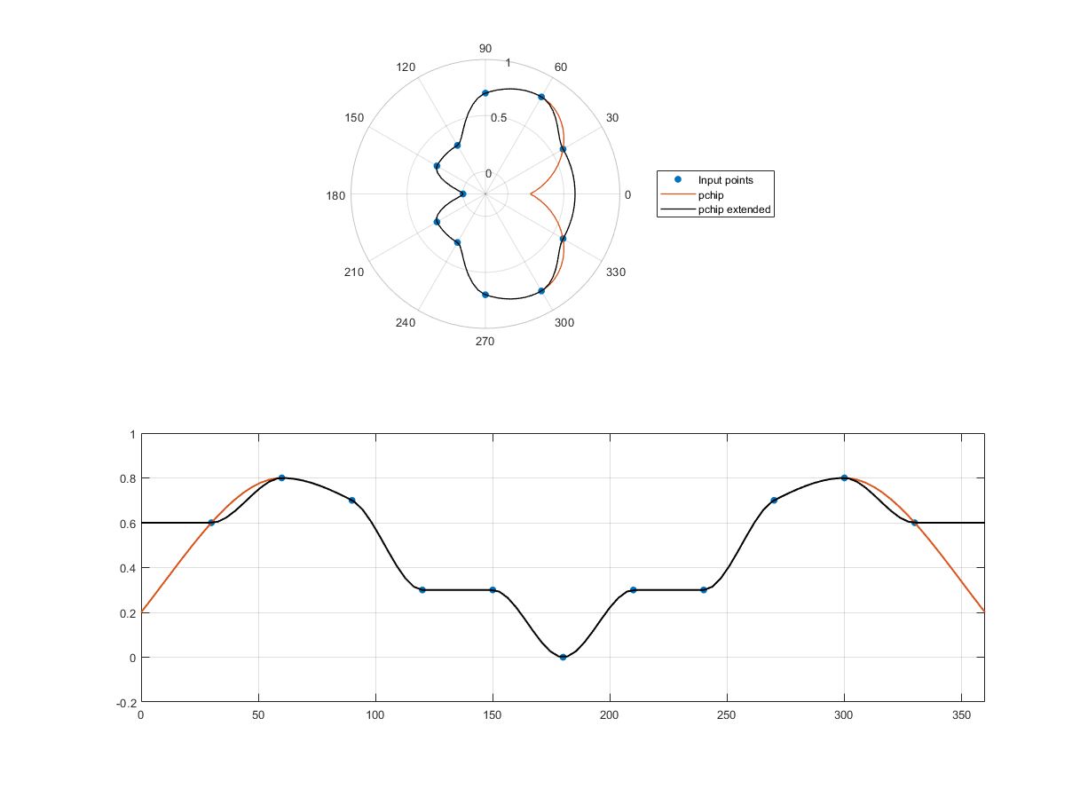 你可以将你的极地图“展开”成笛卡尔图,以便更好地理解这里发生的事情。如下所示,在给定输入的x-y空间中,0和360度与pchip的外推法是非常合理的。