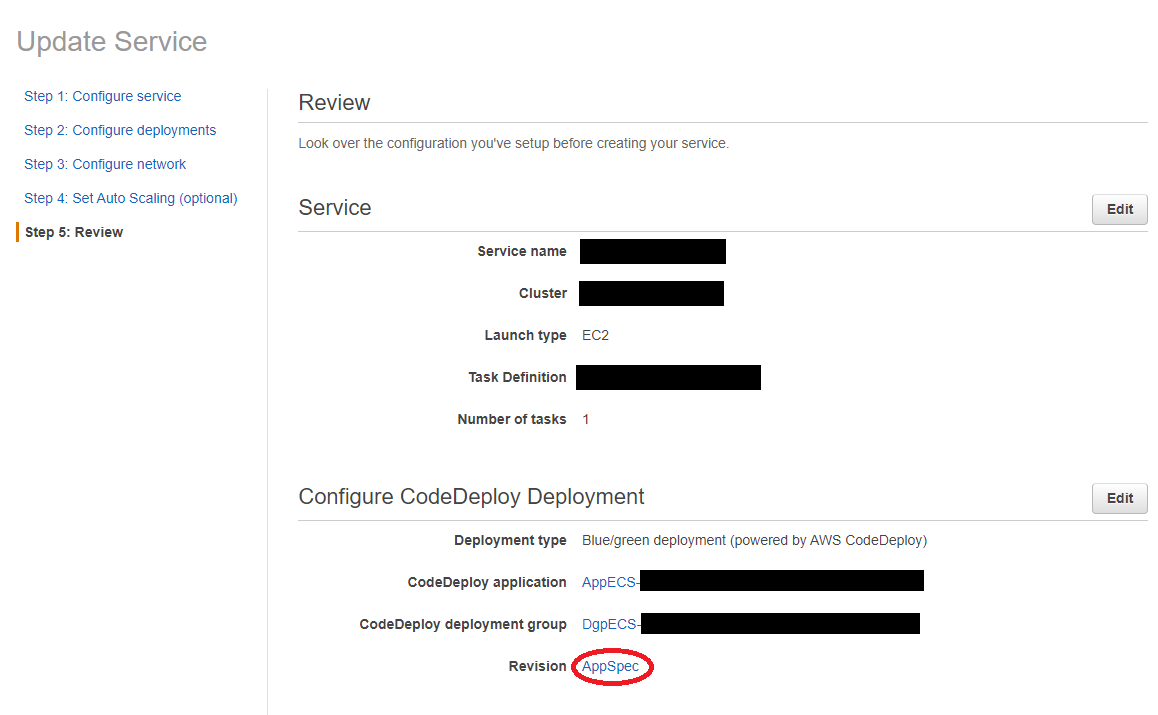 对于appspec.yaml,在对ECS服务进行手动部署时,您可以获得JSON格式的JSON格式,在最后一页中总结所有内容。