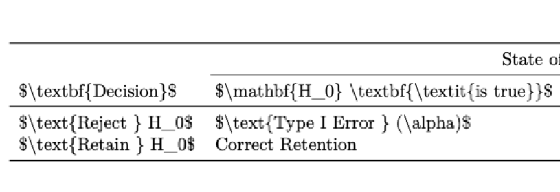 ```{r, echo=FALSE}c1 <- c(‘$\text{H_0$} H_0$',’$\text{Reject} H_0$')