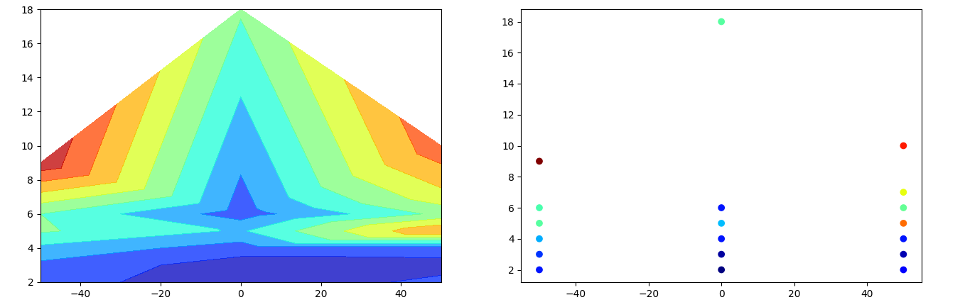 plt.show()右边的图显示输入,颜色为散点图。左图显示相应的等高线图。