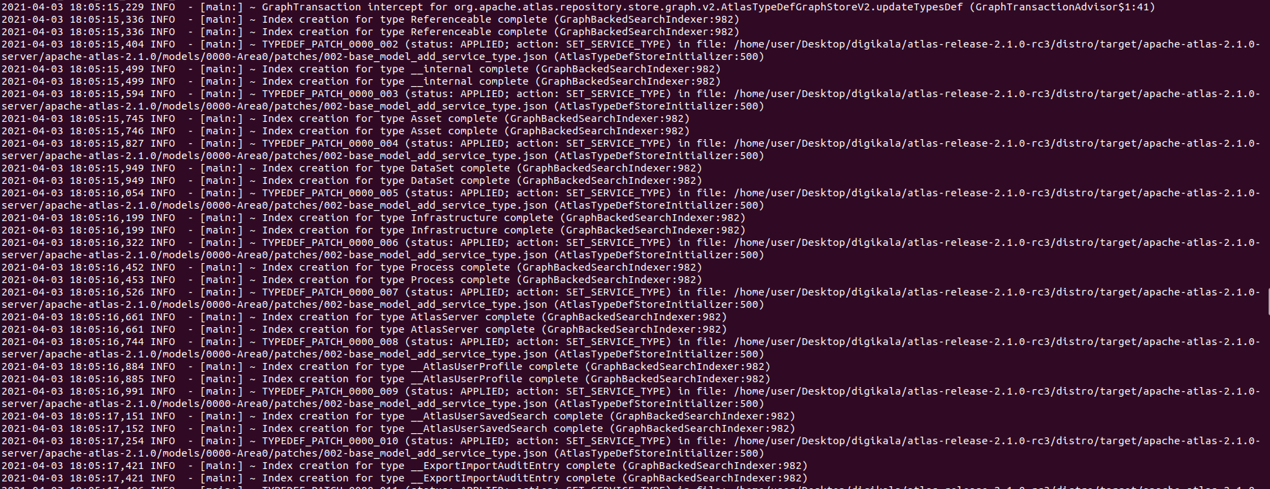 Apache Atlas Server started!!要确保它是否正常工作,请检查日志目录中的application.log。如果一切正常,运行大约10分钟就没有任何错误。