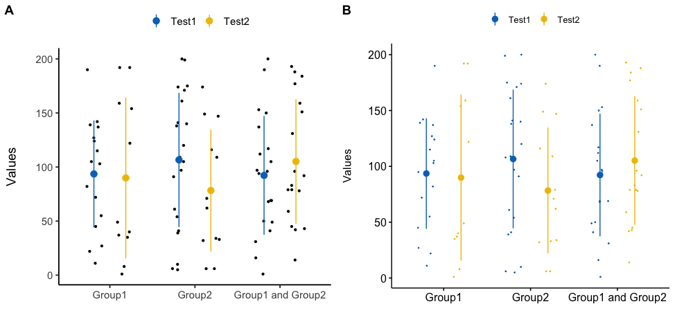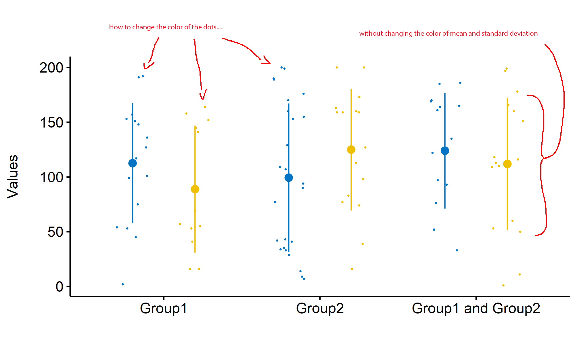 我正在使用ggpubr包的ggerrorplot ()函数来创建下面的图表。我的问题是,是否有任何方法可以改变点的颜色,而不改变代表均值和标准差的点的颜色?观察图像: