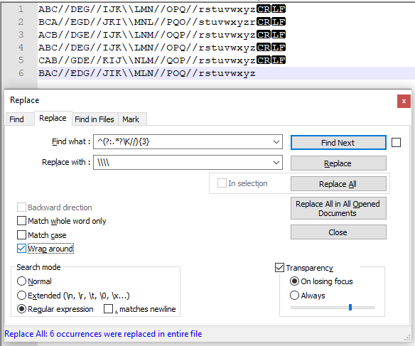 ^(?:[A-Z]+//){2}[A-Z]+\K//^开始(?:[A-Z]+//){2}重复2次匹配大写字符A和//[A-Z]+\K//匹配1+大写字符A-Z,清除匹配缓冲区和匹配//在替换中使用\\\\