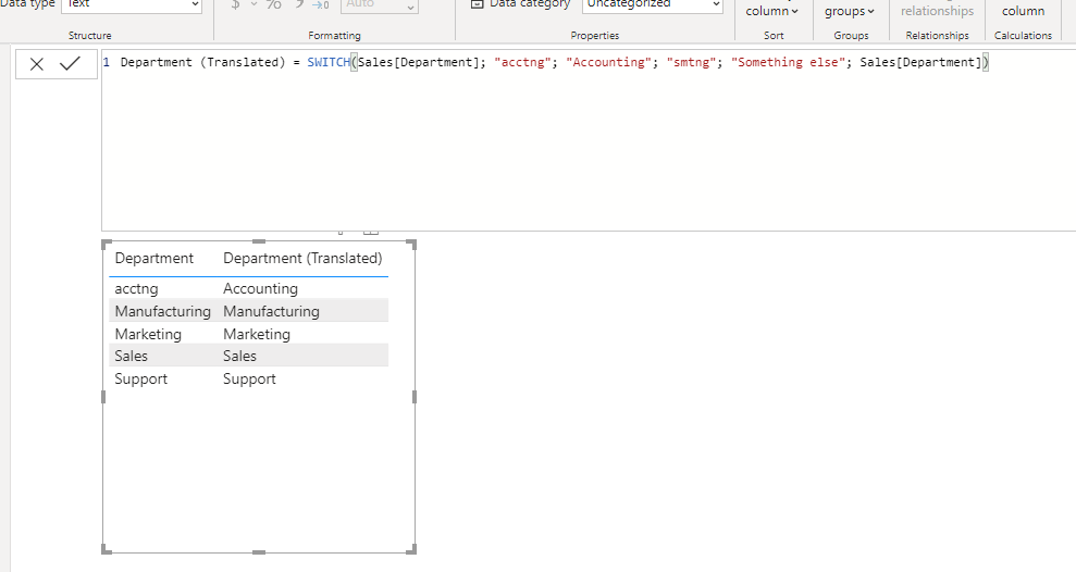 Department (Translated) = SWITCH(Sales[Department]; "acctng"; "Accounting"; "smtng"; "Something else"; Sales[Department])