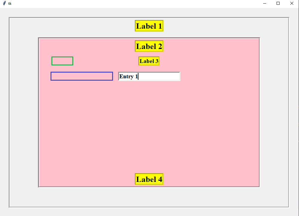 我附上了两张图片,显示我目前正在得到的布局(图1)和我想要的布局(图2)、(绿色框位置的标签3和紫色框位置的条目1)。可以使用pack()作为图像2输出,还是需要grid()或place()输出?