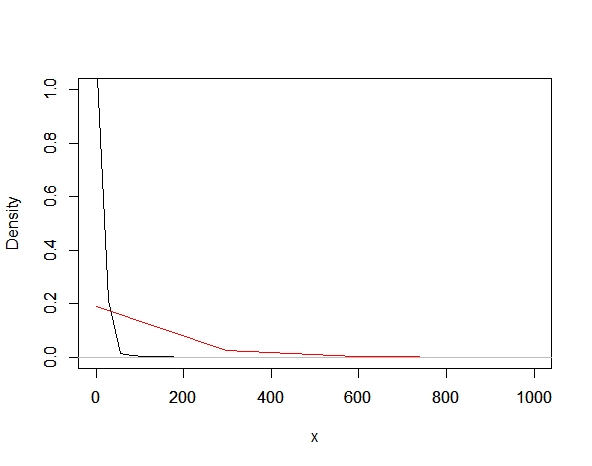 density()有点麻烦。这是一个核密度平滑器,它在离散点上绘制正态分布。由于“权力法”有一条很长的尾巴,这是可疑的。