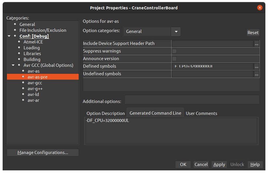 我在MPLAB 5.45下使用AVR GCC编译器v5.4.0。我在avr-as-pre部分中为编译器定义了一个符号。它将以下内容添加到被调用的命令中: