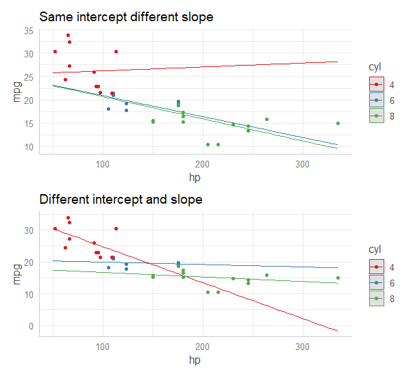 下面我使用mtcars数据集进行可视化,使用mpg作为结果,hp作为数值变量,cyl (作为因素)作为分组变量。置信区间被移除,因为它们对插图不重要。重要的是要注意两个模型是如何不同的 (cyl == 4在一个是正的,另一个是负的!)这进一步说明了为什么方法2往往比前面的方法“更正确”。