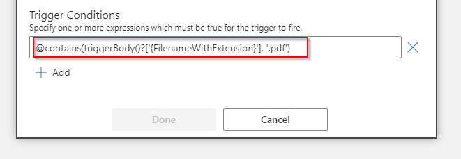 然后将表达式@contains(triggerBody()?['{FilenameWithExtension}'], '.pdf')添加到“触发器条件”。