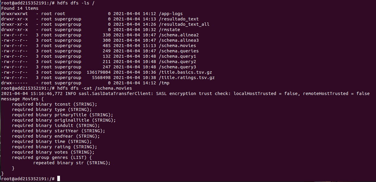 Disconnected from container.正如您所看到的,它说它找不到schema.movies文件,但是您可以看到它在HDFS中已经存储。是因为它没有使用来自org.apache.hadoop.fs.Path?的路径类。因为当我使用下面的代码(使用readAllBytes()路径)运行一个程序时,它会找到我的数据文件,但是在getSchema()中,我需要使用方法,这就是为什么我不在那里使用Path的原因。