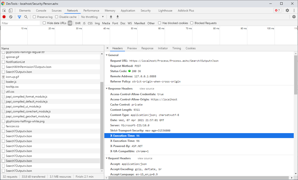 }).then(processes => console.log(processes));注意,如果您只是对响应时间进行故障排除,qbo3将包含一个X-Execution-Time响应头--所有的API调用。此标头不会传递给resolve方法,您可以从Chrome的开发人员控制台的Network表中检查它,如下图所示: