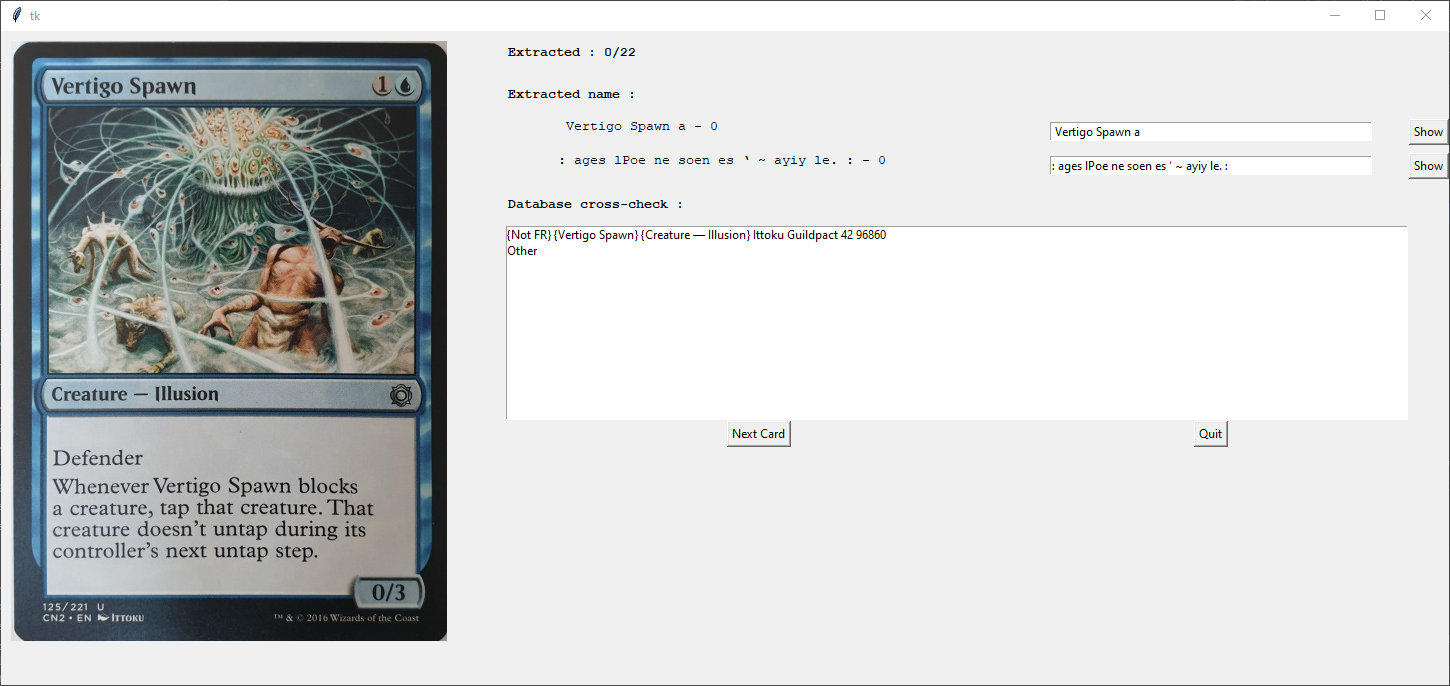 我有大量的魔术收集卡,并写了一个程序,从图片通过OpenCV读取卡片。它处理图片,提取卡片的名称,在JSON文件中搜索它,并将它附加到我的库中。